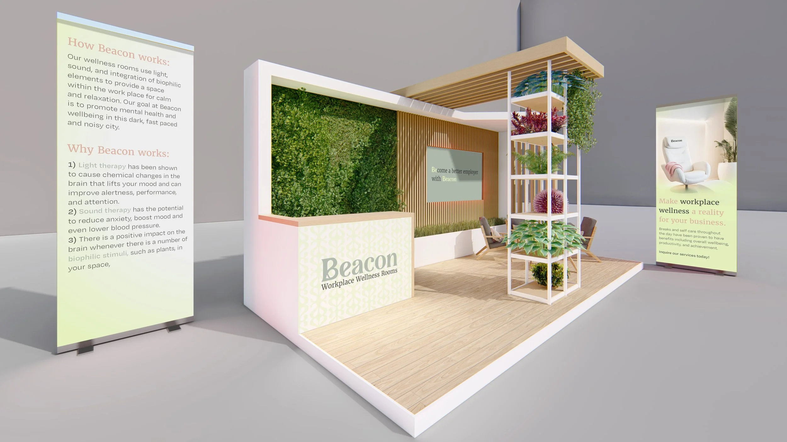 Beacon, Workplace Wellness Rooms, located in office buildings and work spaces, would combine light, noise, and spacial therapy techniques to provide a space within the work place for complete calm and relaxation.