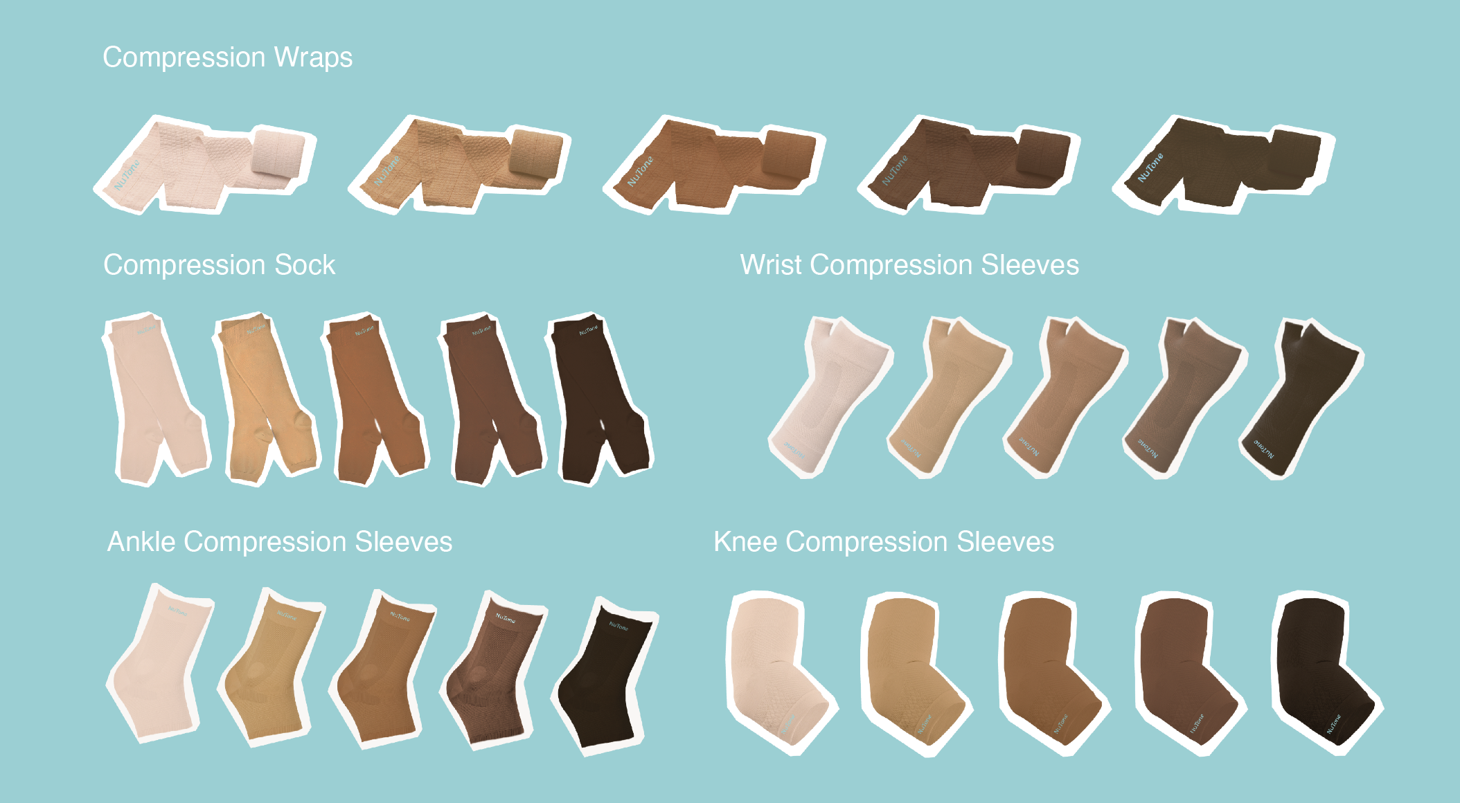 The current market for compression care items—such as wraps, socks, and braces—fails to address the needs of diverse skin tones. The most commonly available colors are beige, white, black, or bright colors, which either do not blend into darker skin tones or draw unnecessary attention to injuries. While some consumers find the aesthetic unappealing, for people of color, the lack of inclusive options highlights a larger issue of underrepresentation in healthcare product design. This creates a disconnect between the healing process and the emotional desire for subtlety, comfort, and dignity. Injuries are personal, and healing should feel empowering—not like standing out or being "othered."